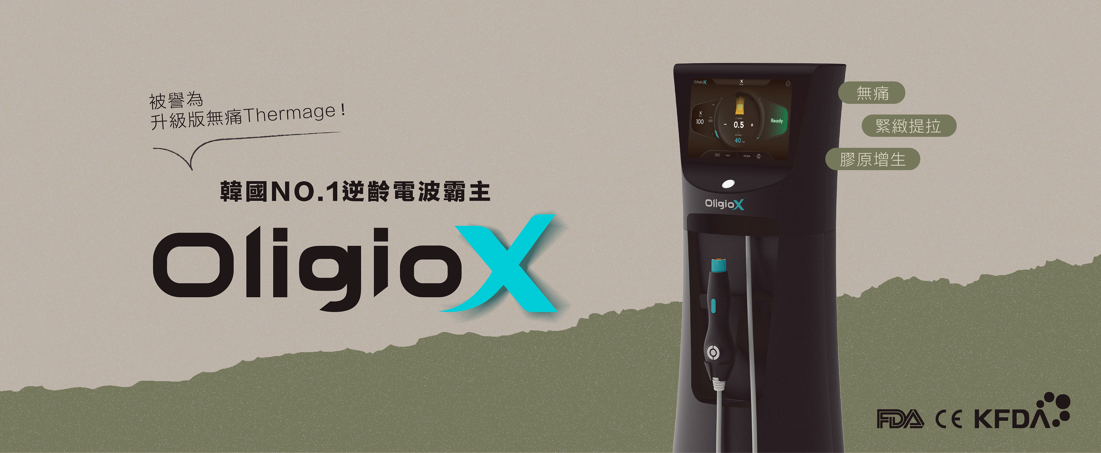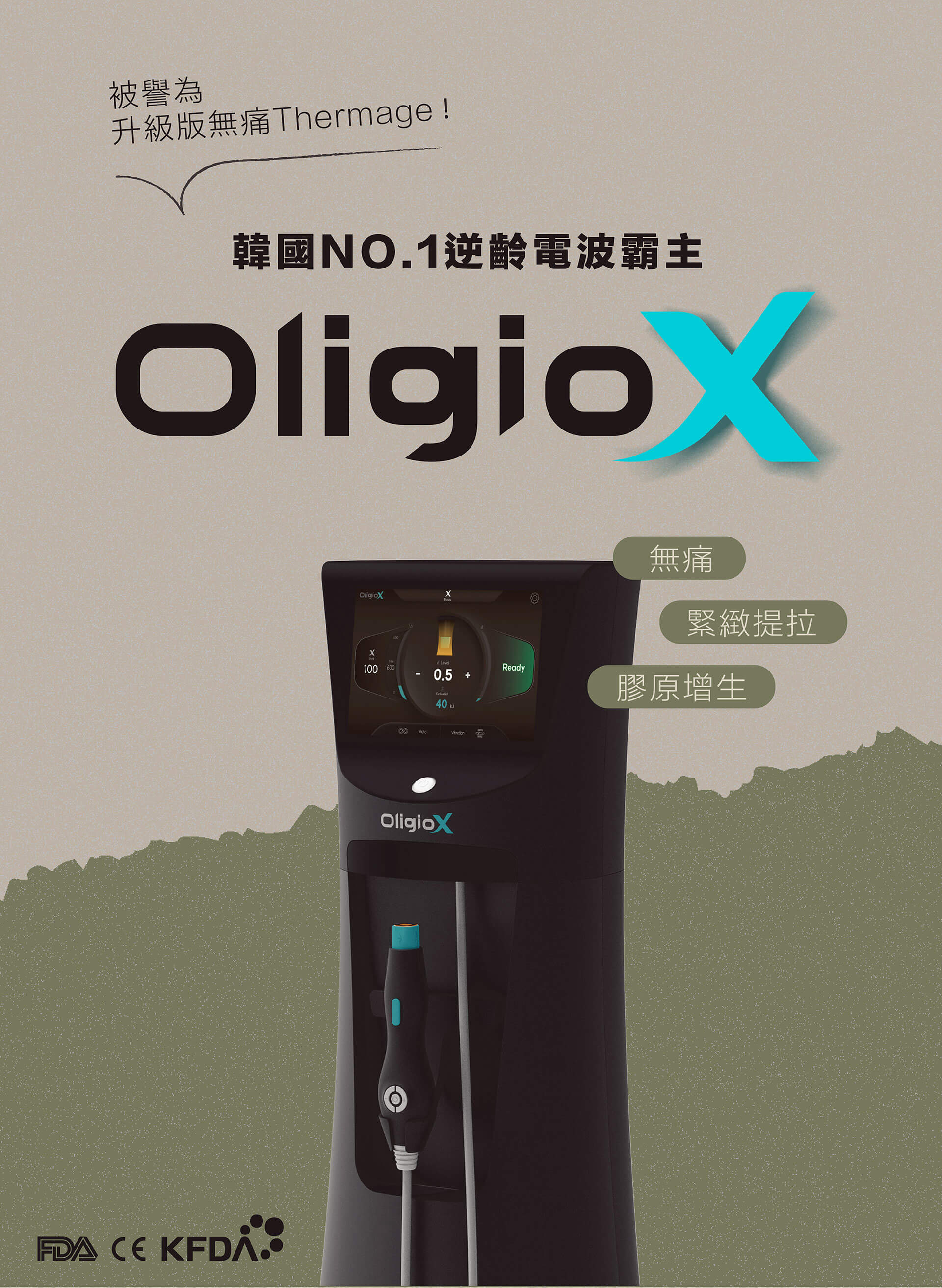 Oligio X 是一項非侵入性的治療,已獲得美國FDA、歐盟CE和韓國KFDA三重認證。 能改善皮膚鬆弛、皺紋及細紋、凹陷、膚色間啞及輪廓模糊等問題,讓皮膚回復平滑緊緻。