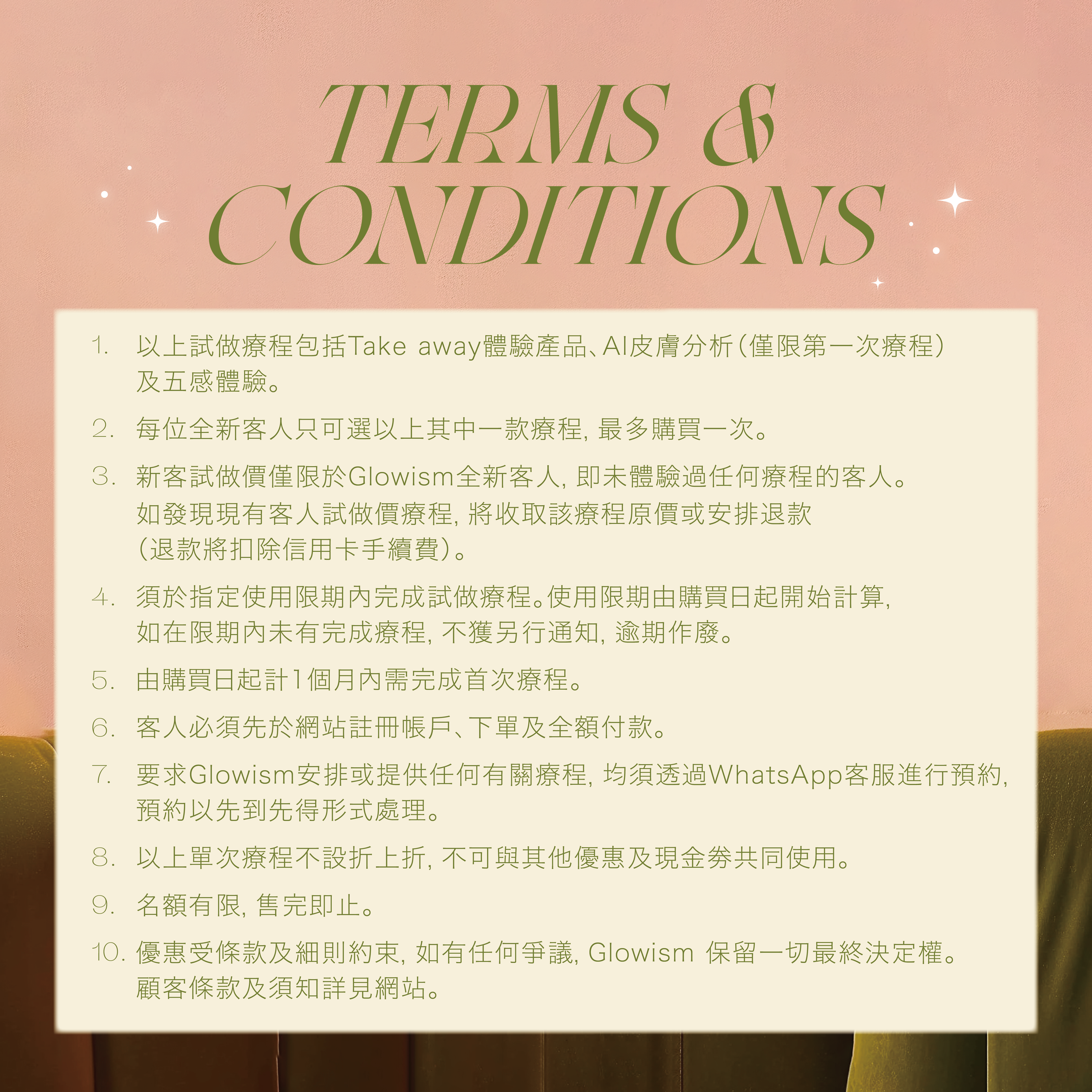 如果您有任何疑問,歡迎您在購買美容服務前,直接聯絡我們CS,我們樂意解答您的問題。 如有任何爭議,Glowism保留最終決定權並無異議。