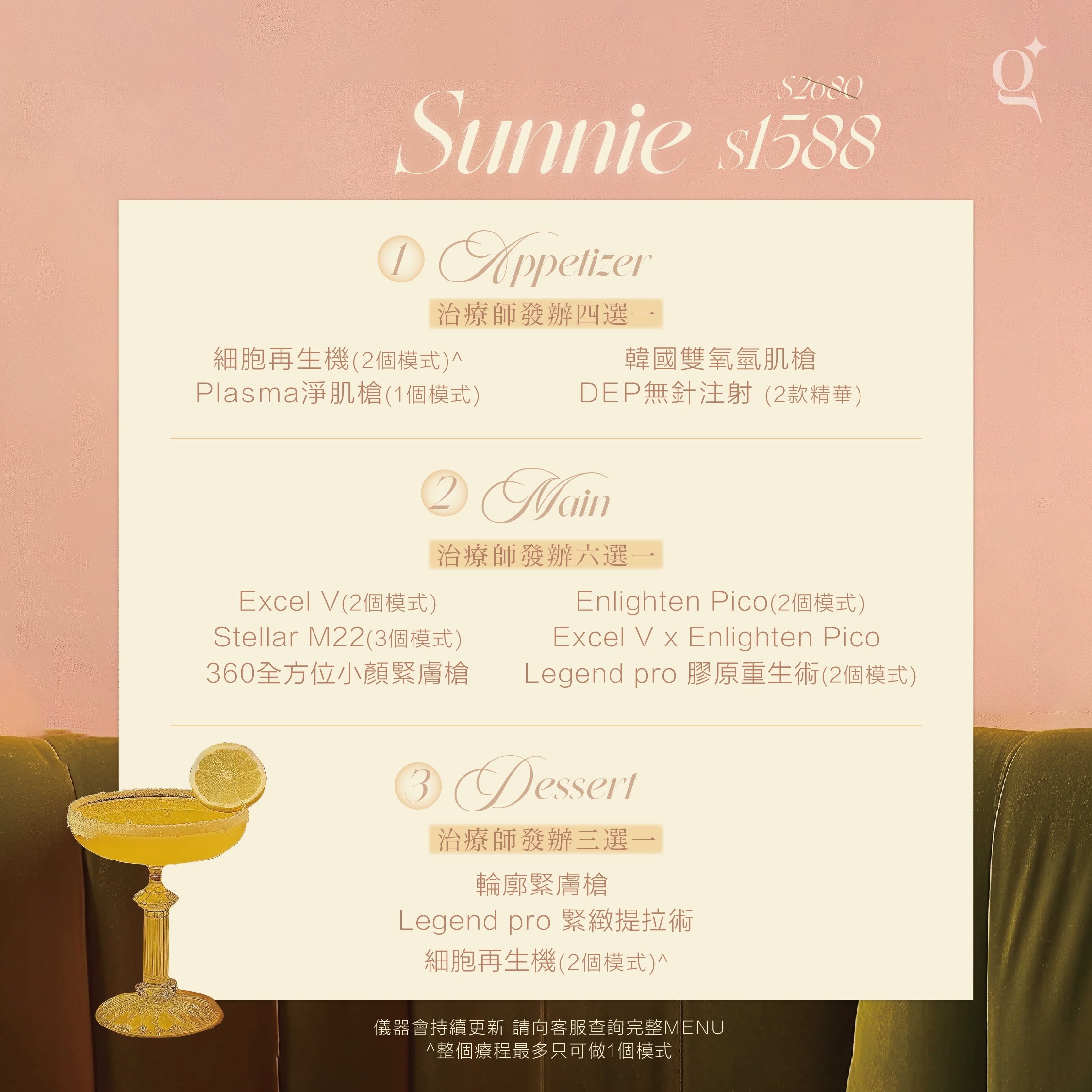 Main Course 全部採用歐美名廠的高能量醫美儀器,特設儀器放題,不計發數,務求達到最極致、最驚艷的療程效果!